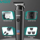 ماشین اصلاح وی جی ار مدل 937 یک ماشین اصلاح بسیار با کیفیت با طراحی ارگونومیک میباشد این دستگاه دارای یک نمایشگر دیجیتال میباشد که میزان شارژ دستگاه و قابلیت نیاز بودن به روغن را نشان میدهد.و دارای 3 عدد شانه 1 و 2 و 3 میباشد
