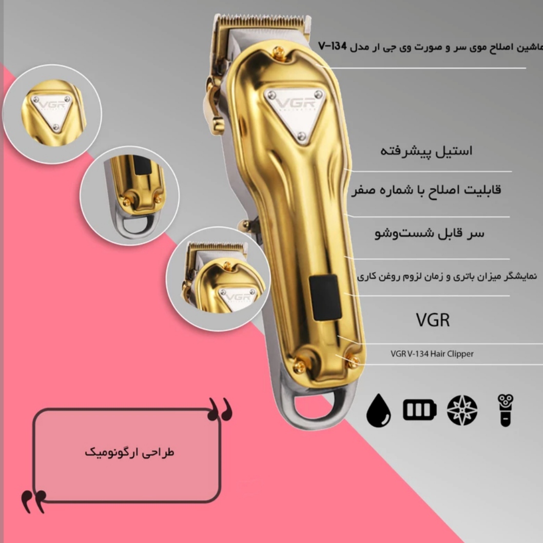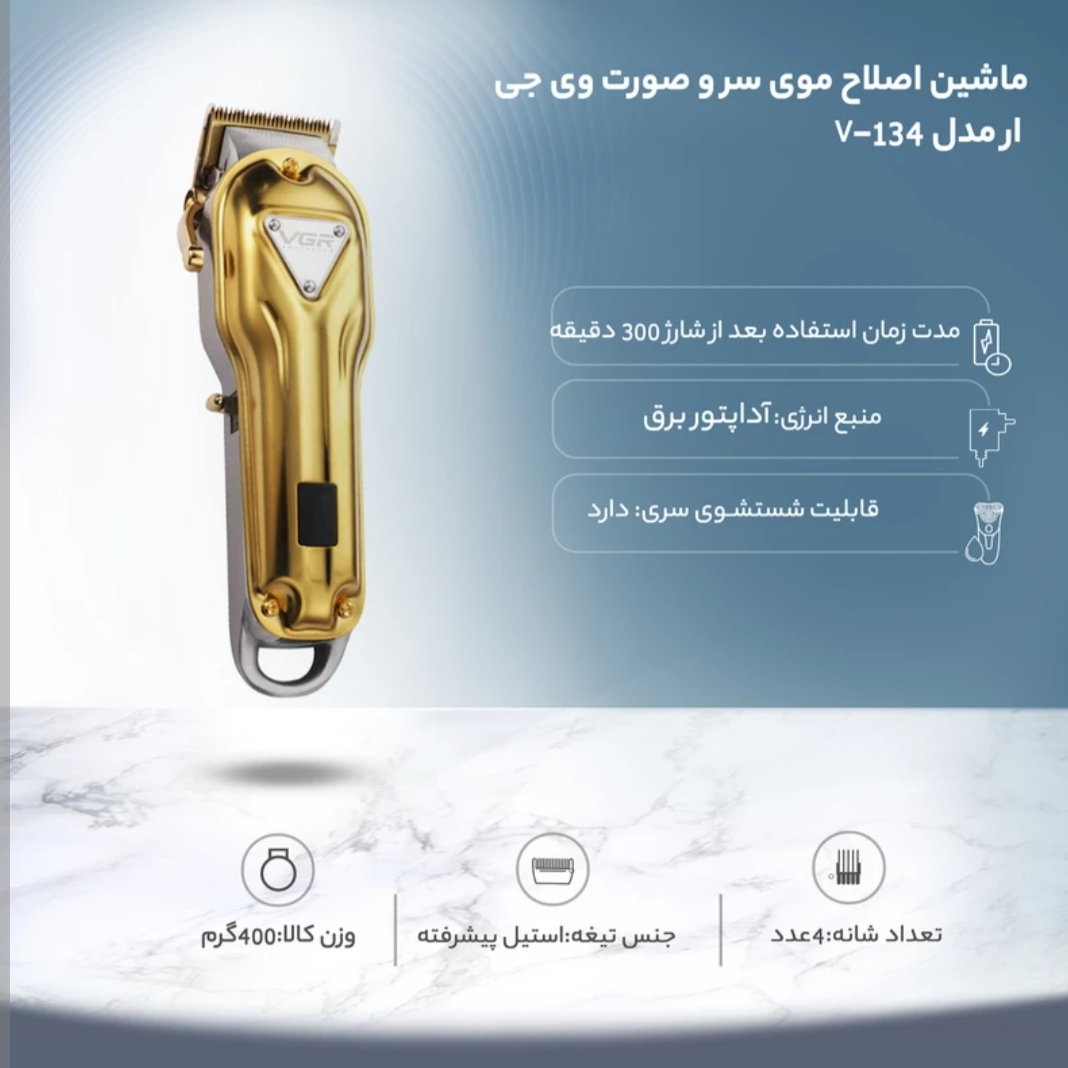 ماشینهای اصلاحی که مخصوص اصلاح موی سر ساخته میشوند، باید موتور قدرتمندی داشته باشند؛ زیرا موهای سر ضخیم بوده و نسبت به صورت و بدن تراکم بیشتری دارند. ماشین اصلاح V-134 ساخت شرکت «وی.جی.آر» با داشتن موتور لرزشی فوق العاده قوی مناسب استفاده برای اصلاح موهای ضخیم است. تیغهی ماشین اصلاح از جنس استیل پوشش داده شده با کروم است که در برابر زنگزدگی مقاوم است. به کمک این تیغه میتوان موهای سر را در اندازههای 1 تا 3.5 میلیمتر کوتاه کرد.جنس بدنه این ماشین اصلاح فلزی و در دو رنگ نقره ای و طلایی بوده که کار کردن با آن حس خوشایند کار با یک محصول با کیفیت را به شما می دهد. در کنار دستگاه، اهرم تنظیم چرخشی قرار دارد که اگر دستگاه را با دست راست بگیرد، با انگشت شست بهراحتی میتوان آن را در جای مناسب تنظیم کرد. به کمک این اهرم میتوان فاصلهی بین تیغههای بالا و پایین را تغییر داد و بدون استفاده از شانه، طول اصلاح دلخواه را تنظیم کرد. هنگامی که این اهرم به پایین فشار داده میشود، طول برش تیغهها افزایش مییابد و وقتی در بالاترین موقعیت قرار دارد، تیغهها در کمترین فاصله از هم قرار میگیرند.این محصول از باتری پر قدرت 2500 میلی آمپری بهره می برد که با 180دقیقه شارژ میتوان به مدت 300 دقیقه از آن استفاده نمود. همچنین یک صفحه LCD جهت اطلاع از میزان شارژ باقیمانده و زمان لزوم روغن کاری تیغه ، بر روی بدنه دستگاه تعبیه شده است. برای اصلاح مو در اندازههای مختلف 4 عدد شانهی اصلاح با طول برش 1.5 تا 6 میلیمتر ارائه شده که روی تیغه قفل میشوند. داخل جعبه شانه، برس تمیزکننده و روغن نیز قرار داده شده است. تیغههای ماشین اصلاح در کارخانه تنظیم و روغنکاری شدهاند و ممکن است با بازکردن جعبه در اولین مرتبه، اثرات آن را مشاهده کنید. چنانچه تیغهها برای تمیزکردن یا تعویض باز شوند، مجددا باید تنظیم شوند. تیغههای ماشین اصلاح پس از هر بار استفاده باید روغنکاری شوند. برای این کار باید از روغن شرکت وی.جی.آر که داخل جعبه قرار دارد استفاده شود. توجه داشته باشید که برای روغنکاری تیغهها از گریس، روغن مو و هر روغنی که حاوی مواد نفتی یا حلال باشد استفاده نکنید؛ زیرا با تبخیر حلال آنها لایهی ضخیمی از روغن بین تیغهها باقی میماند که حرکت تیغهها را کند میکند.