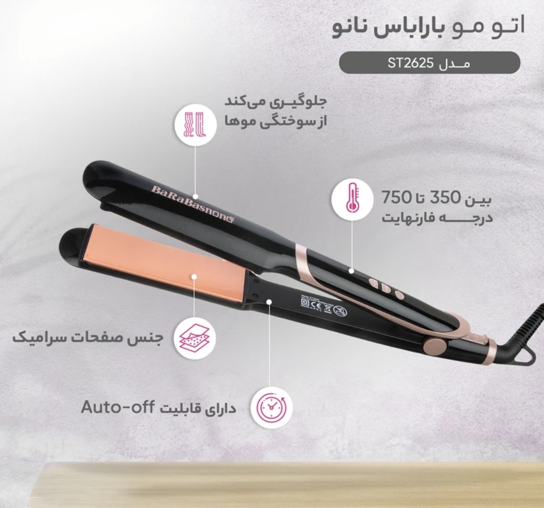 برند باراباس نانو دارای محصولات متنوع و حرفهای است که در سالنها برای آرایشگران و حتی مصرف کنندگان در منزل مناسب است. اتو مو باراباس نانو مدل ST2625 محصولی با طراحی نوین که در عین زیبایی، دارای صفحات سرامیکی است. صفحههای سرامیکی حرارت را به طور یکنواخت توزیع کرده و از سوختگی موها جلوگیری میکند. با توجه به ظرفیت گرمایی بالای سرامیک ، صفحه سرامیکی گرمای خود را برای مدت طولانی حفظ میکند.