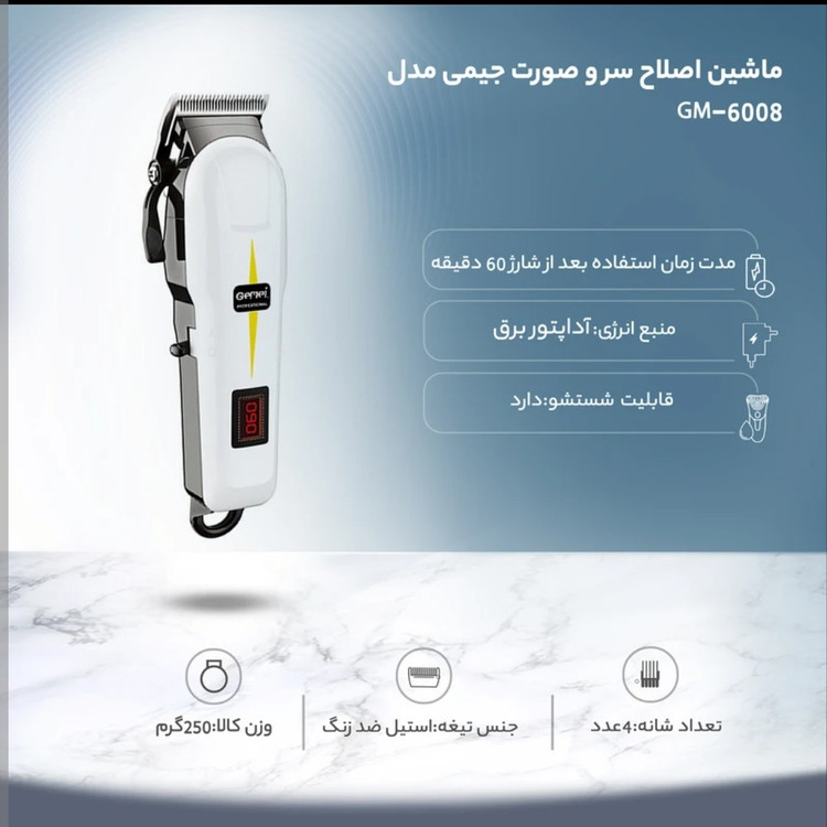 ماشین اصلاح سر و صورت جیمی مدل GM-6008، یک ماشین اصلاح حرفهای مخصوص آقایان بوده که برای اصلاح سر و صورت مناسب است و یک گزینه عالی برای کسانی است که به دنبال ماشین اصلاح پر قدرت با قابلیت تنظیم درجه اصلاح هستند. این ماشین اصلاح دارای کیفیت و جنس بدنه عالی بوده به رنگ سفید براق همراه با تیغههای استیل ضد زنگ موجود است. تیغههای دستگاه از استیل ضد زنگ هستند و حساسیت ایجاد نمیکنند. این دستگاه دارای چهار شانه است که با توجه به انتخاب شما تغییر میکند. سایز شانهها 3، 6، 10 و 13 است که به همراه محصول ارسال خواهند شد. به وسیله اهرم قابل تنظیمی که در سمت چپ دستگاه تعبیه شده است، میتوان سایز اصلاح را به صورت دستی تنظیم کرد و استفاده از 4 شانه کمکی که همراه این دستگاه قرار داده شده است، کار را بیش از پیش راحت میکند. این ماشین اصلاح با دارا بودن بدنه ارگونومیک و خوشدست، مناسب استفاده طولانی است؛ به گونهای که اصلا احساس خستگی به شما القا نخواهد کرد. منبع تغذیه این ماشین اصلاح از آداپتور برقی است که در بستهبندی این محصول قرار دارد و میتوان هم با شارژ و هم با برق مستقیم از آن استفاده کرد. مدت زمان شارژ کامل باتری در این ابزار، 180 دقیقه و زمان شارژدهی آن 1 ساعت است. همراه با محصول، برس تمیز کننده وجود دارد؛ برای افزایش طول عمر تیغهها توصیه میشود بعد از استفاده از ماشین اصلاح آنها را با برس تمیز کنید.