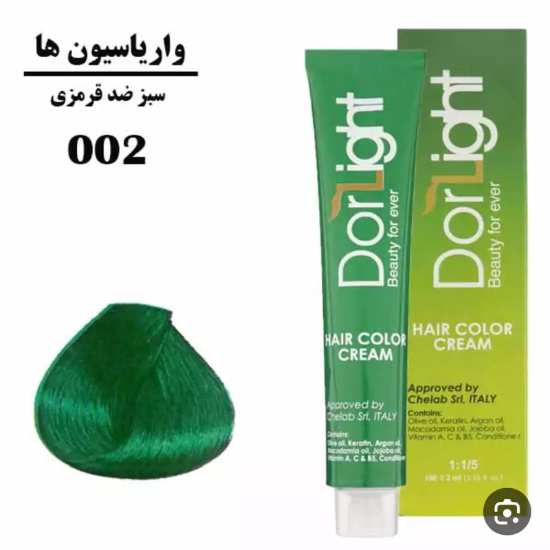 رنگ موی واریاسیون سبز ضد قرمزی شماره 002 دورلایت با حجم 100 میل تاریخ انقضاء تا سه سال همه رنگهای فانتزی موجود هست