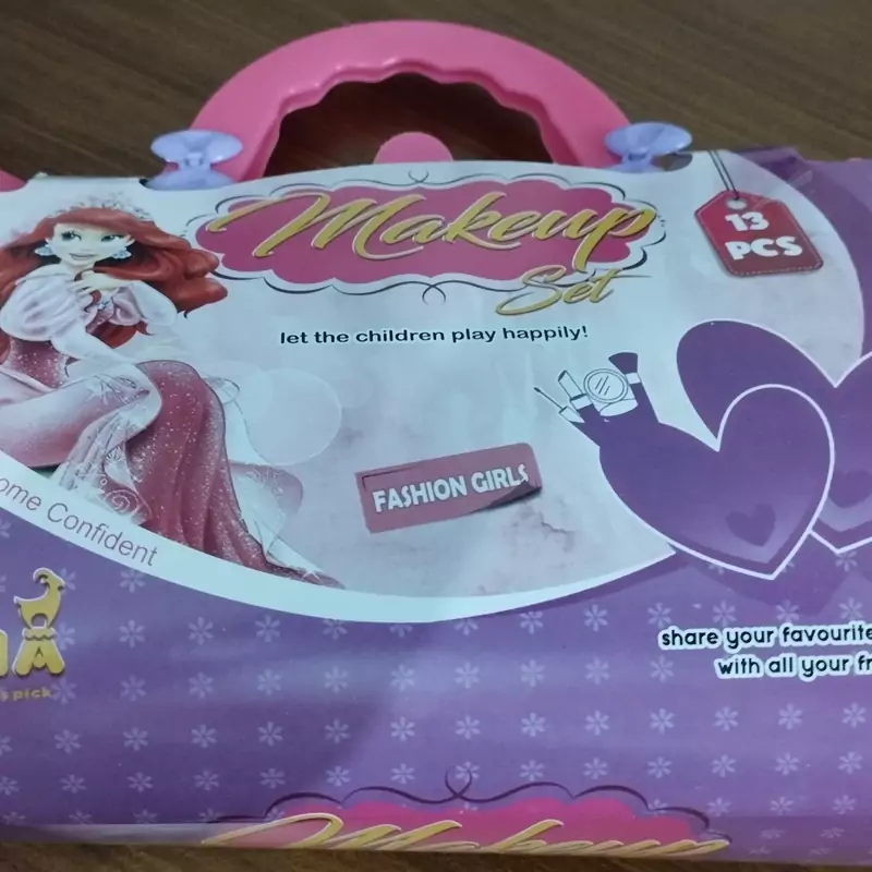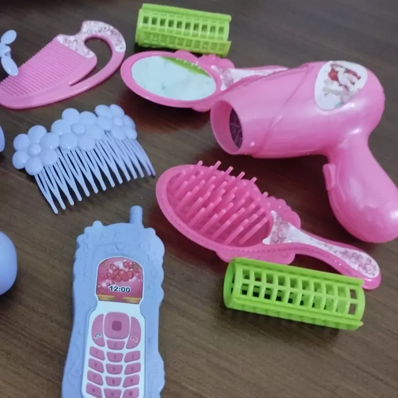 اسباب بازی دخترانه کیفی صورتی با وسایل ارایشی، سشوار، شانه، آینه، لاک، عطر، موبایل، دوربین، فرکن، ناخن، شانه مویی