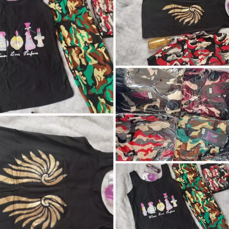 لباس ست زنانه راحت ارتشی و نرم با تاپ مشکی وشلوار ارتشی کشی جنس ضخیم در 4رنگ، سبز لجنی، قهوه ای، طوسی، زرشکی