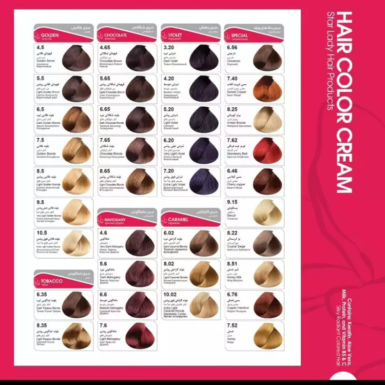 رنگ موی با کیفیت مارک استار لیدی حجم 120 میل دارای مواد کراتین برای موها رنگ موی استار لیدی با آمونیاک خیلی کم میباشد حاوی روغن آرگان،روغن زیتون ، روغن جوجوبا ،روغن ماکادمیا میباشد آبرسان و جلوگیری از خشکی و موخوره حاوی کراتین ترمیم کننده بافت کراتین مو حفظ رطوبت مو و جلوگیری از خشکی و آسیب دیدگی انها