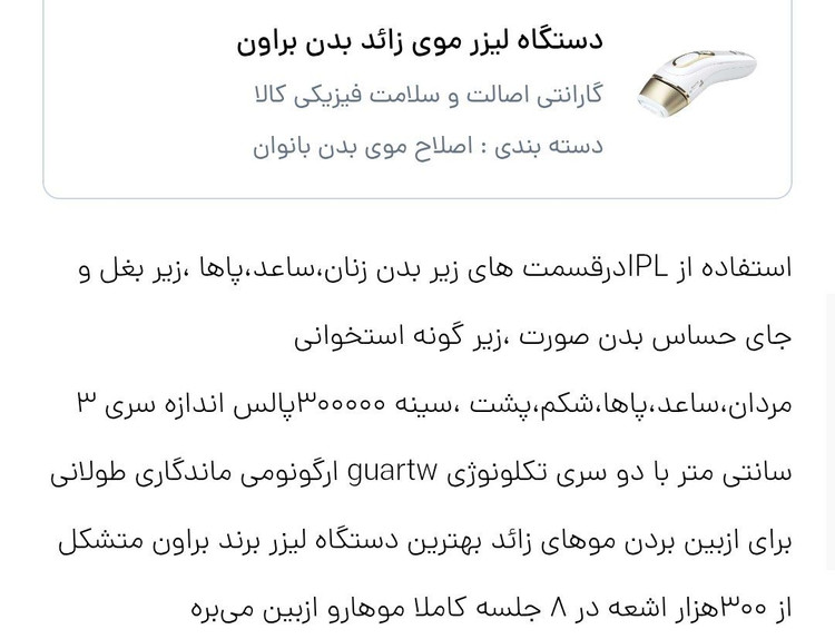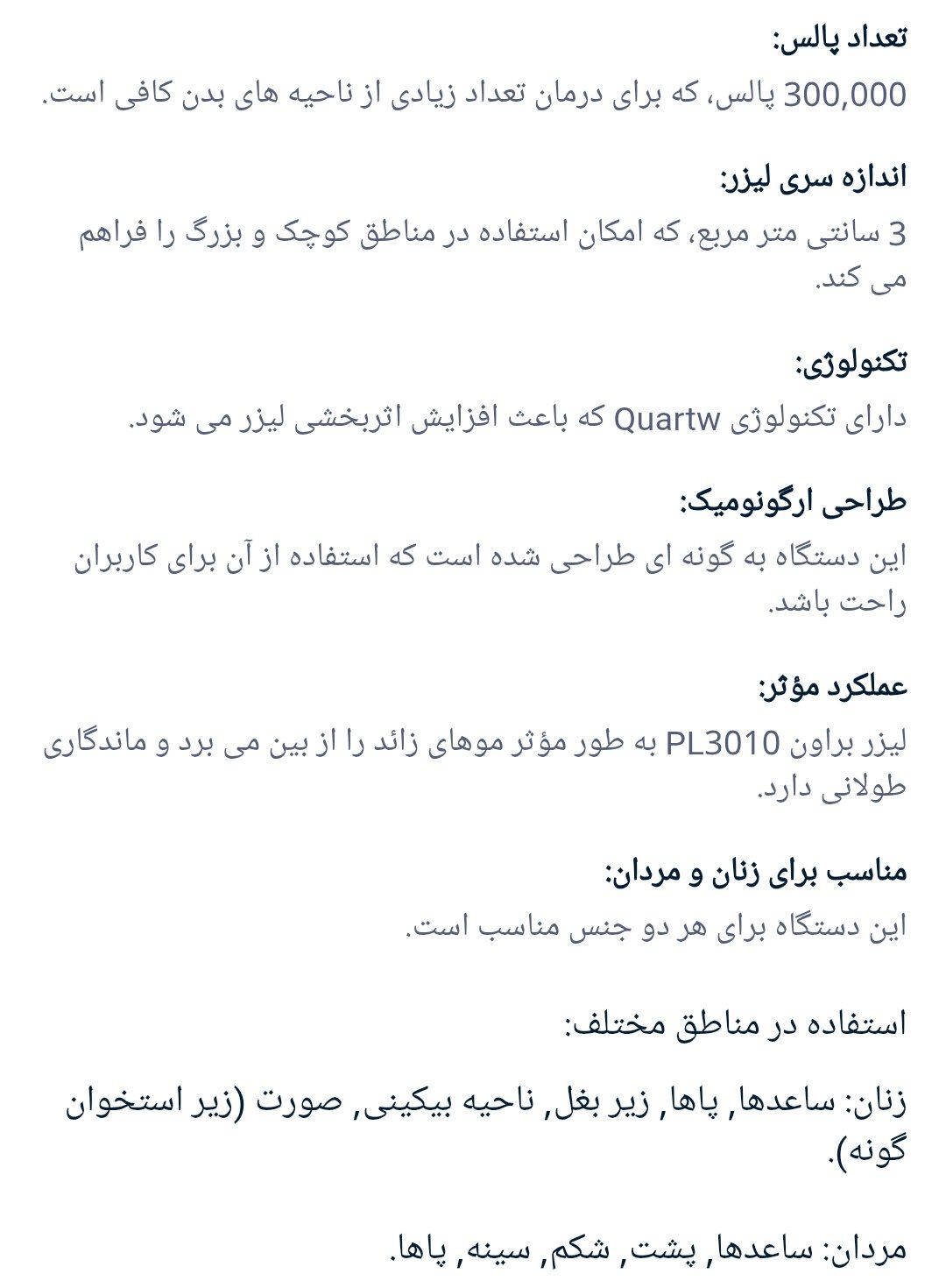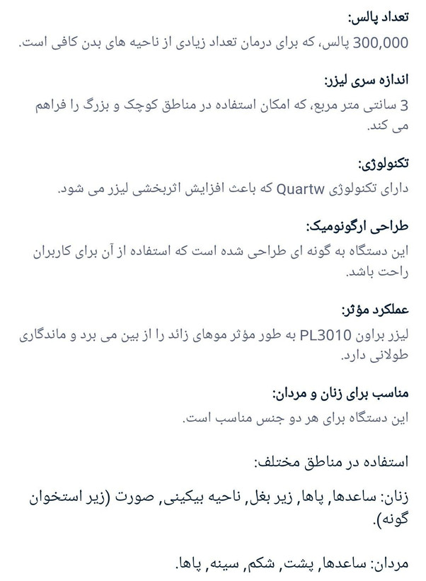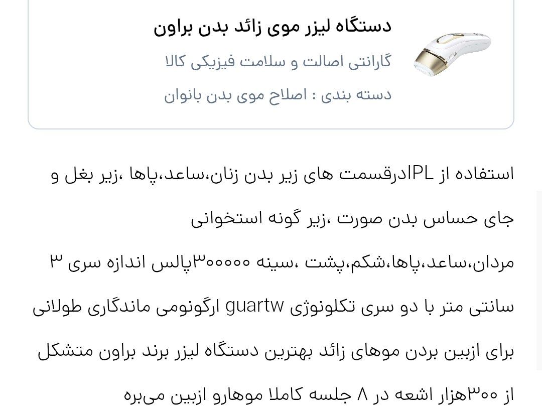 دیدن محصولات مرتبطاستفاده از IPLدرقسمت های زیر بدن زنان،ساعد،پاها ،زیر بغل و جای حساس بدن صورت ،زیر گونه استخوانی مردان،ساعد،پاها،شکم،پشت ،سینه ۳۰۰۰۰۰پالس اندازه سری ۳ سانتی متر با دو سری تکلونوژی guartw ارگونومی ماندگاری طولانی برای ازبین بردن موهای زائد بهترین دستگاه لیزر برند براون متشکل از ۳۰۰هزار اشعه در ۸ جلسه کاملا موهارو ازبین میبره
