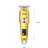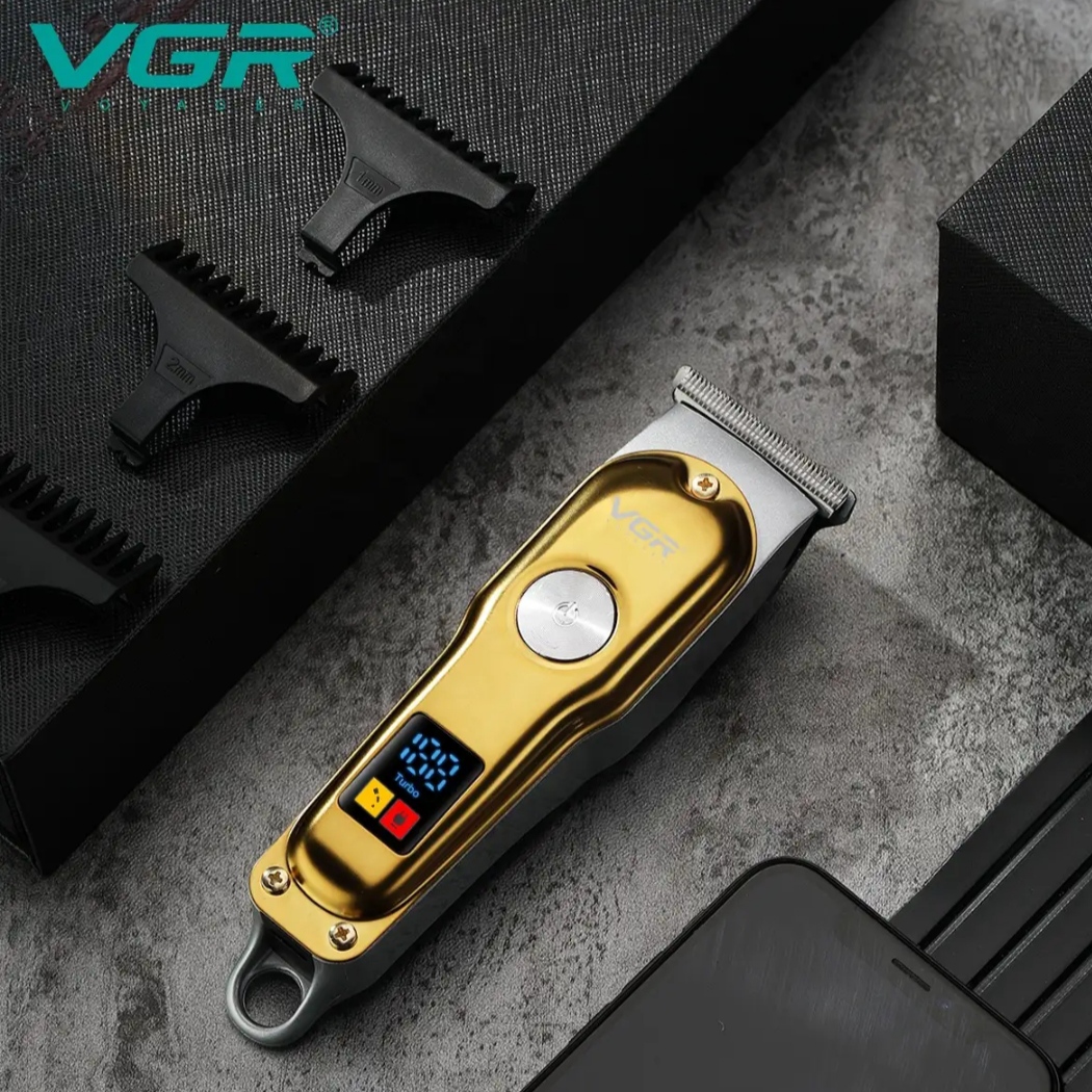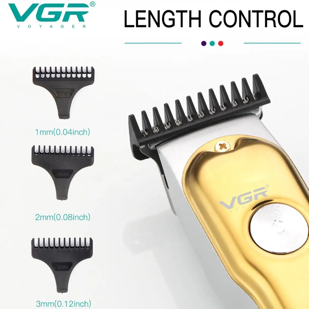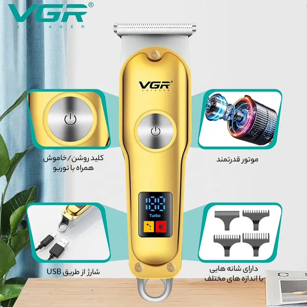 ماشین اصلاح وی جی ار یک ماشین اصلاح بسیار با کیفیت با طراحی ارگونومیک میباشد این دستگاه دارای یک نمایشگر دیجیتال میباشد که میزان شارژ دستگاه و قابلیت نیاز بودن به روغن را نشان میدهد.این ماشین اصلاح قابلیت این دوسرعته شدن دارد و همچنین قابلیت استفاده همزمان با برق و شارژ را دارد.و دارای 3 عدد شانه 1 و 2 و 3 میباشد
